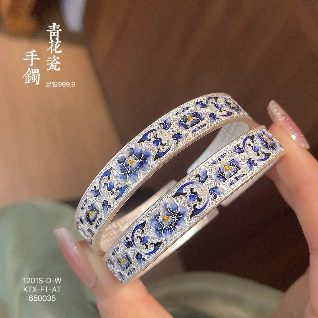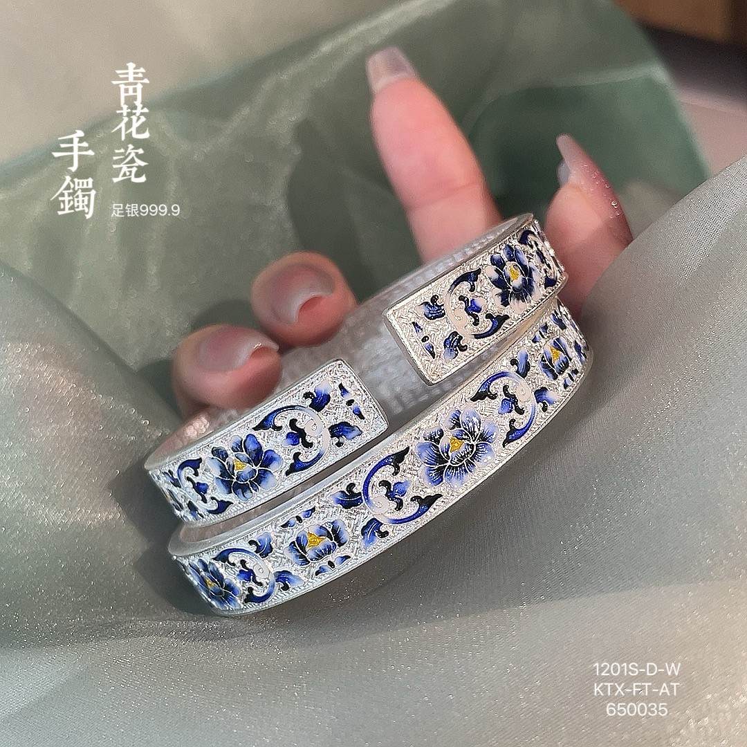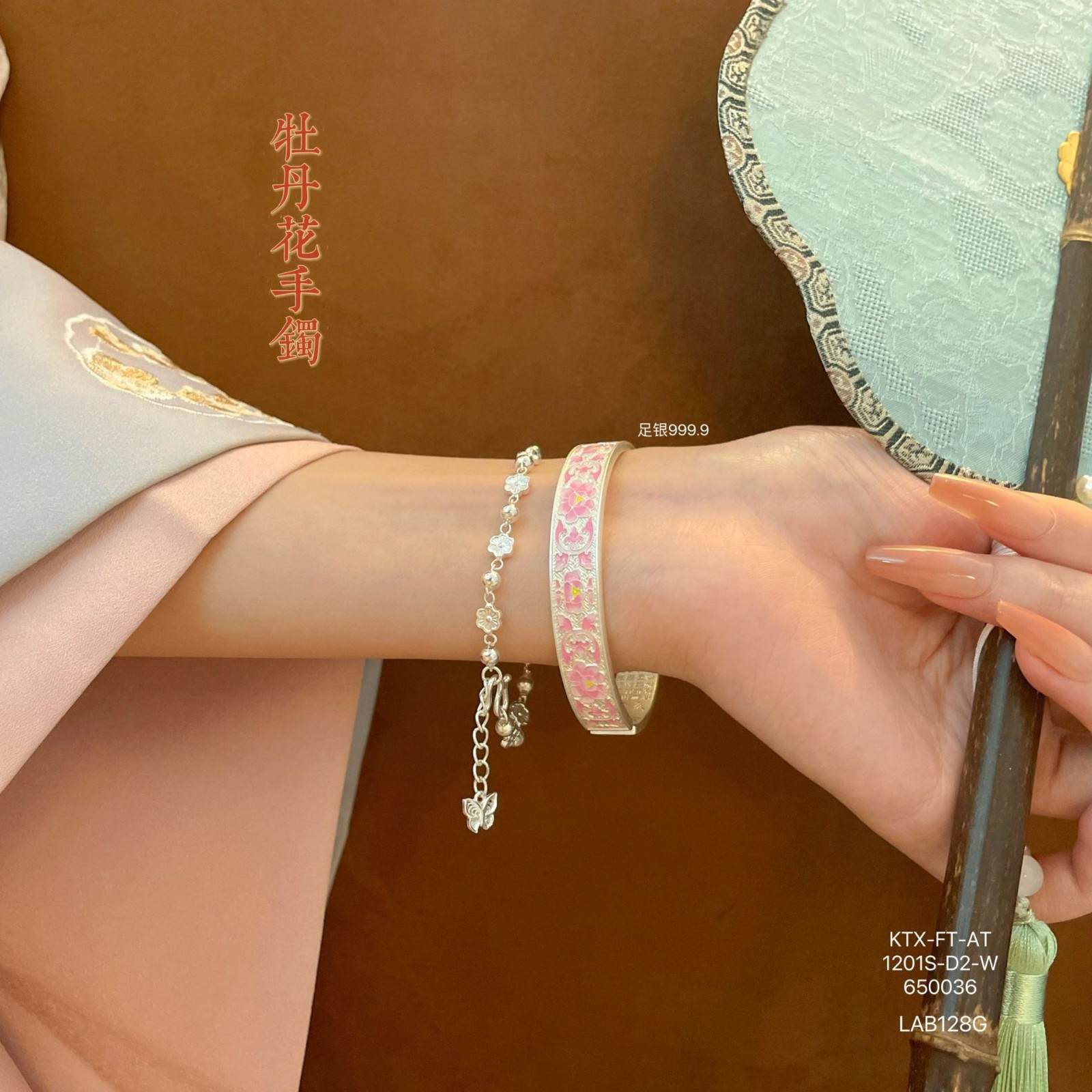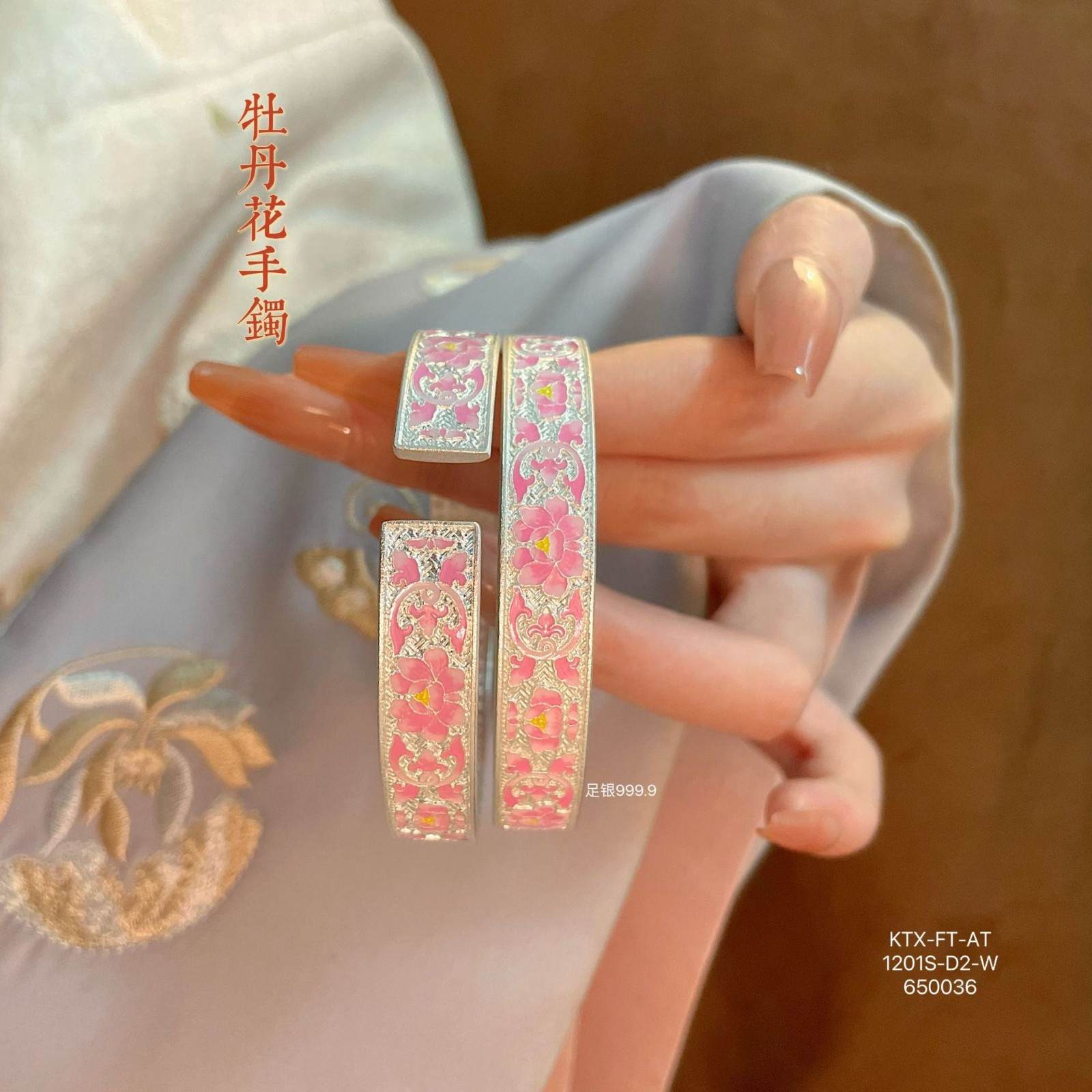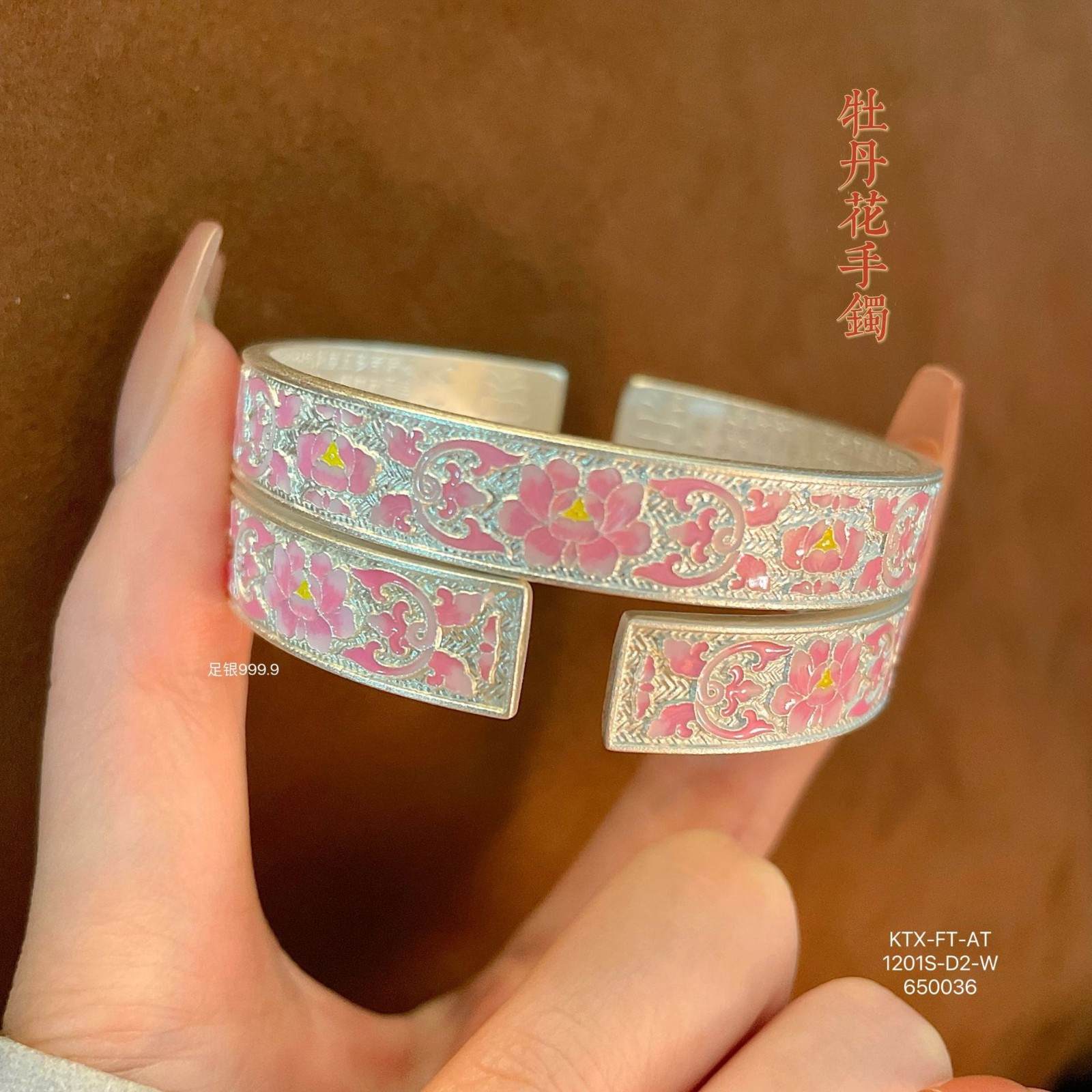 足银999.9古法珐琅牡丹花瓷心经底开口手镯 重量 :36g±(预售7天发货)