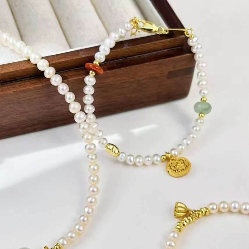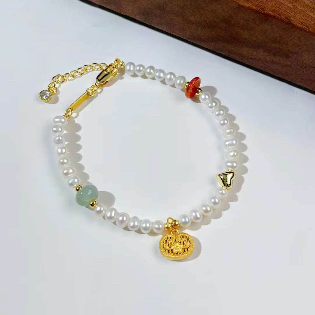S925银天然珍珠南红翡翠设计感花丝镂空锁包手链