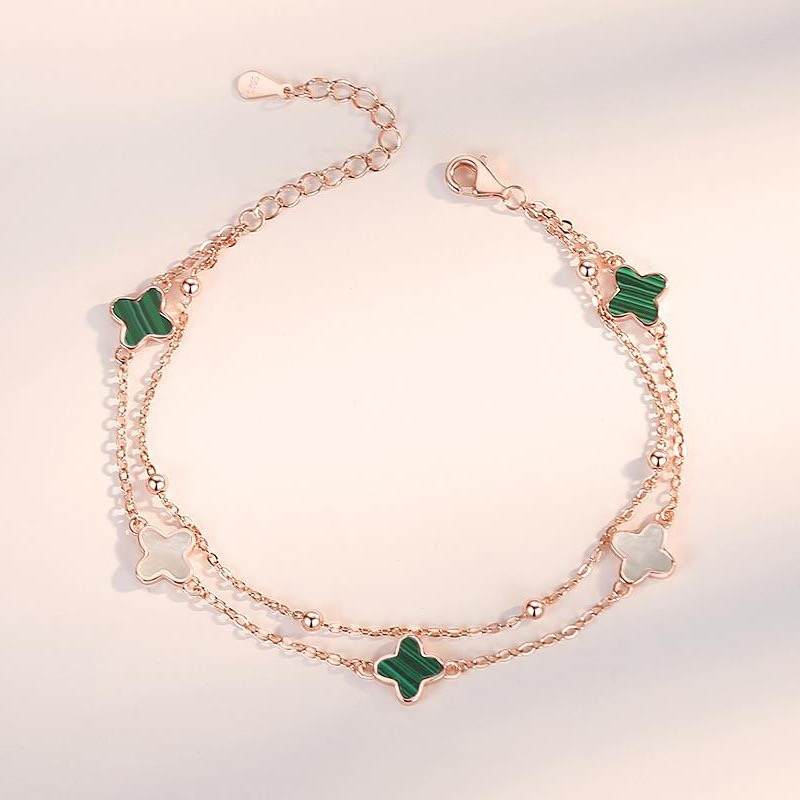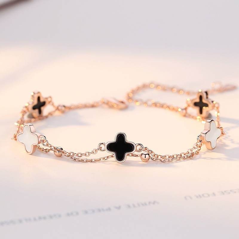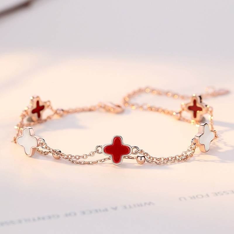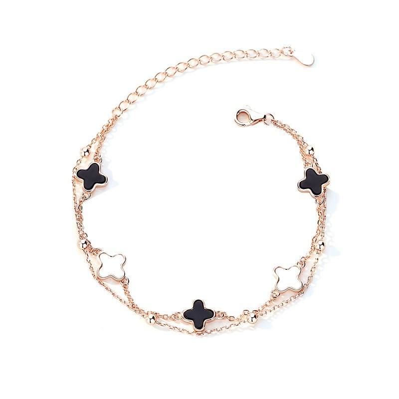 S925银四叶草五花简约玛瑙双层玫瑰金手链