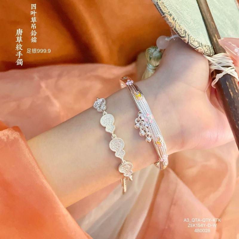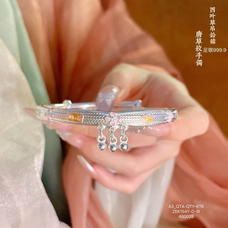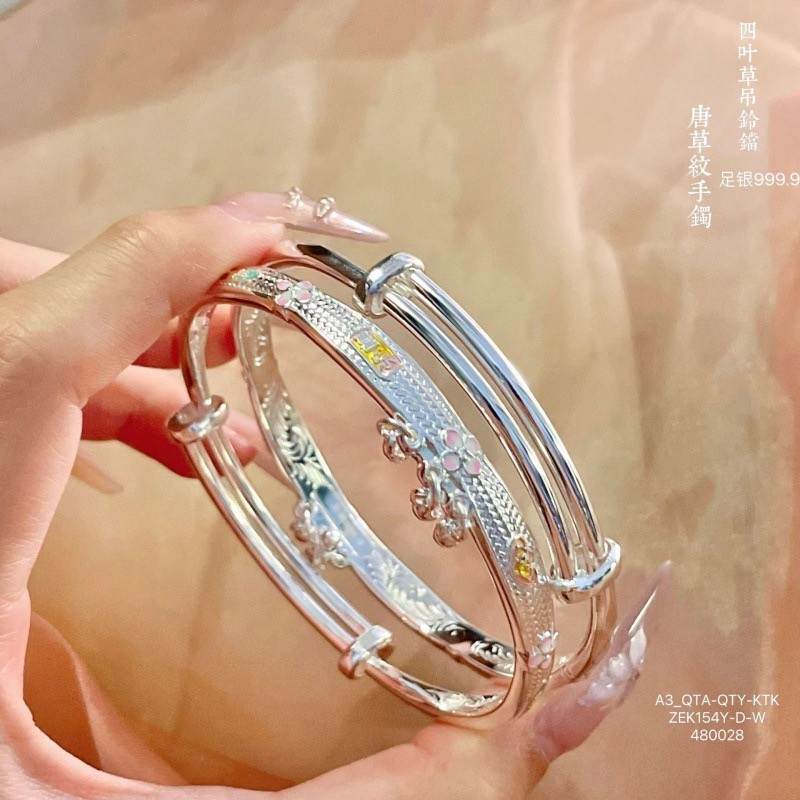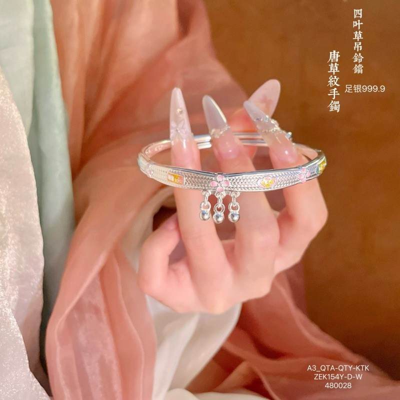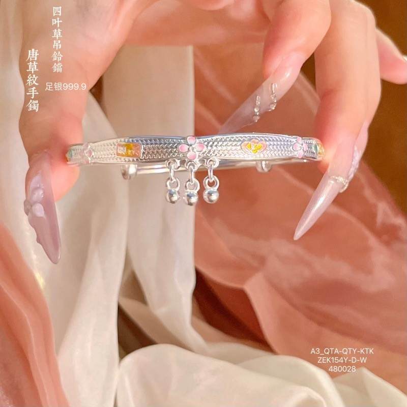#足银9999四叶草铃铛唐草纹电银珐琅推拉手镯 重量:约28g(预售3-7天发货)
