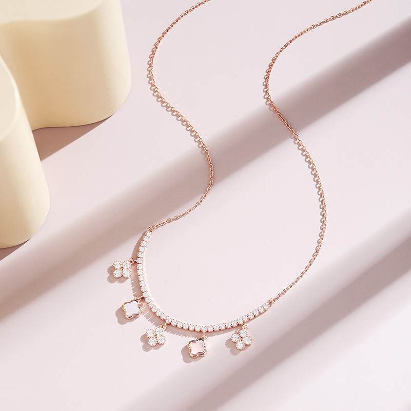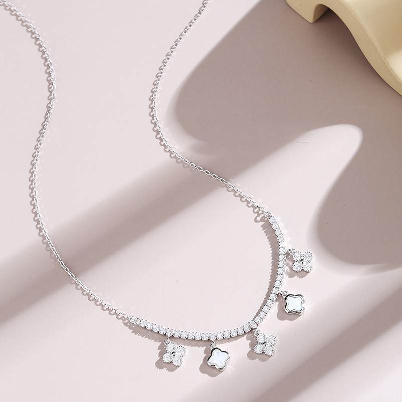 S925银气质贝母锆石四叶草拼接流苏套链