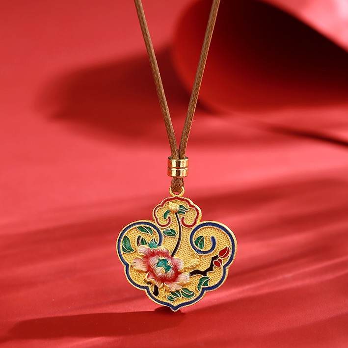 足银9999古法珐琅牡丹纹理双面如意锁民族风绳编套链 克重约:10.3g