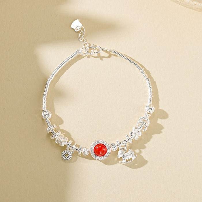 S925银盘缠天然红玛瑙串珠小马钱币手串